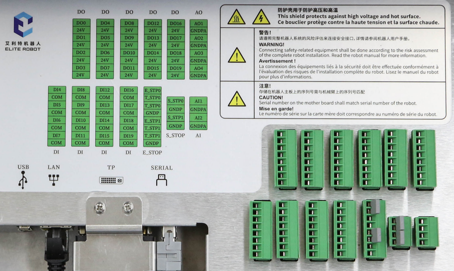 控制箱中包含数字 I/O、模拟 I/O 和所有安全 I/O ,其中E_STOP端子排为控制外部停止相关配置,S_STOP端子排为控制防护停止相关配置,如 图 2-1 所示。