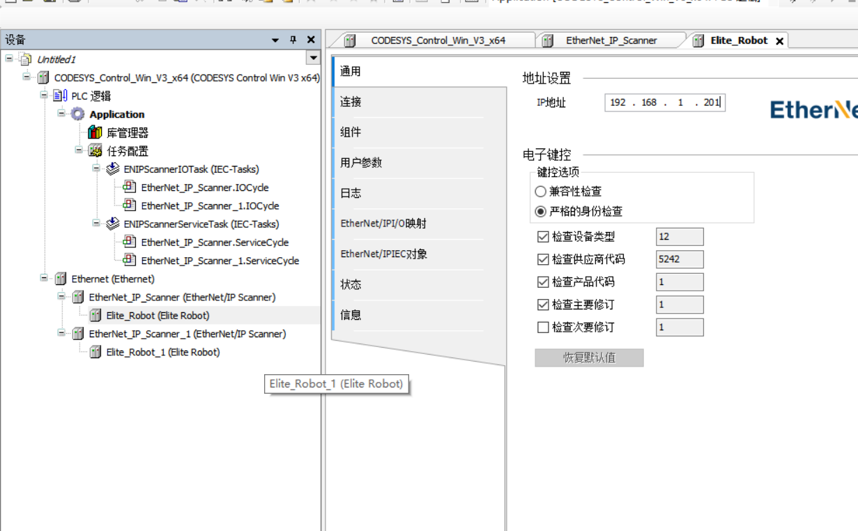 选择 Ethernet/IP Scanner,点击右键选择添加设备,选择 Elite Robot,点击右下角添加设备