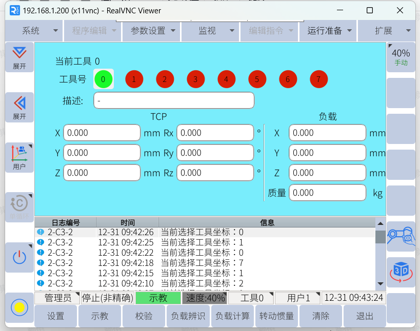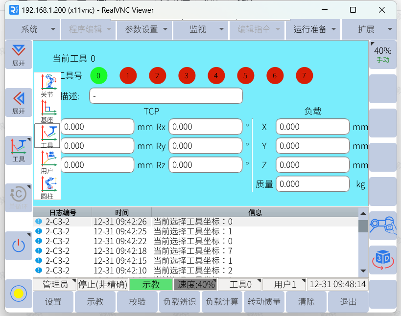 3.运行准备—工具负载设置—选择一个工具号,左下角设置使工具号变成绿色即可打开。