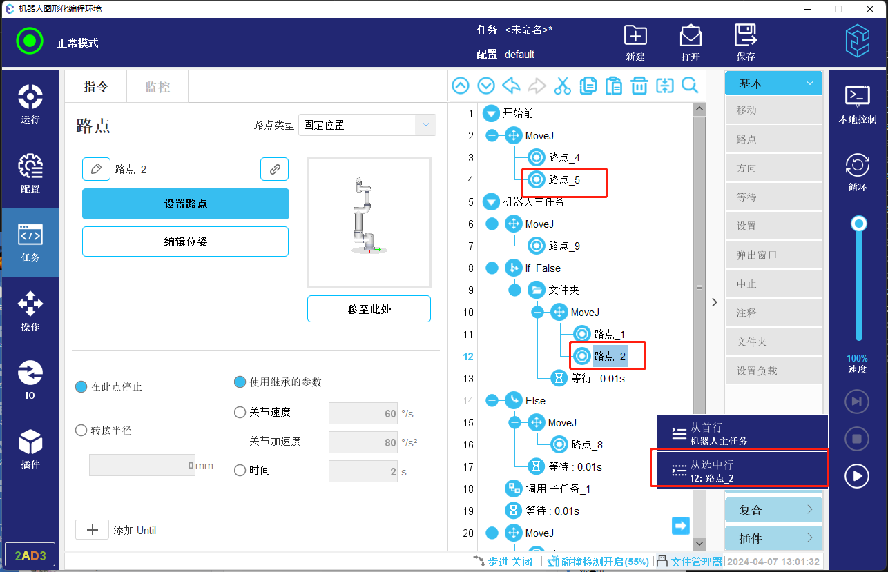 4.  如果当前选中的任务节点上方无可以运行到的节点并且内部也没有可以运行到的点,则会直接开始运行,不再继续向后考虑支持运行到的路点。所以下方图-13所示程序会支持开始运行,不会已路点_4作为起始位置。
