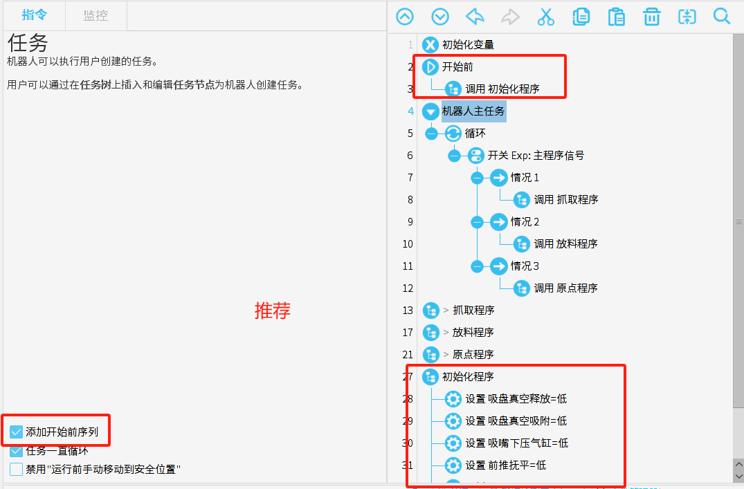 推荐在主程序里加循环,防止有人更改循环模式,导致程序无法运行。