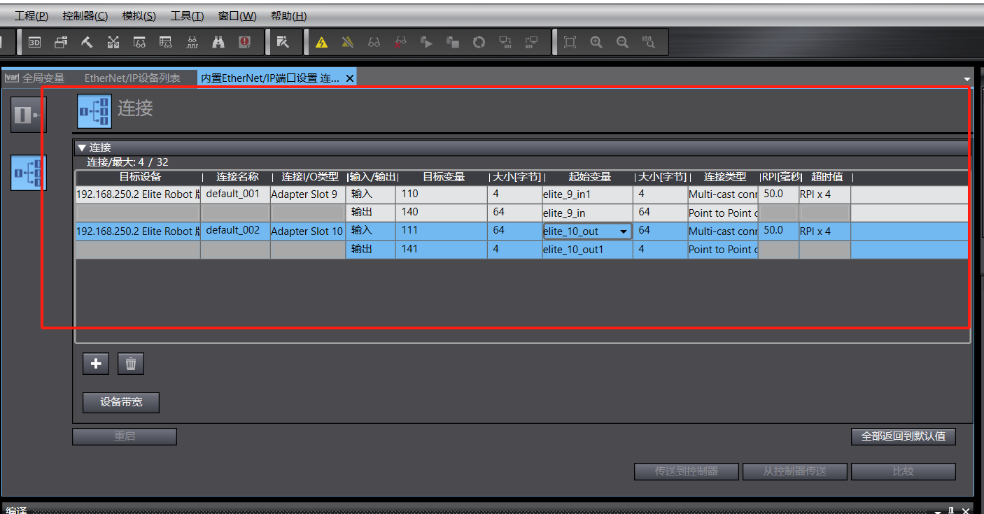 12、 全局变量设置完成后,点击上方栏工具选项,找到 EtherNet/IP 连接设置点击进入