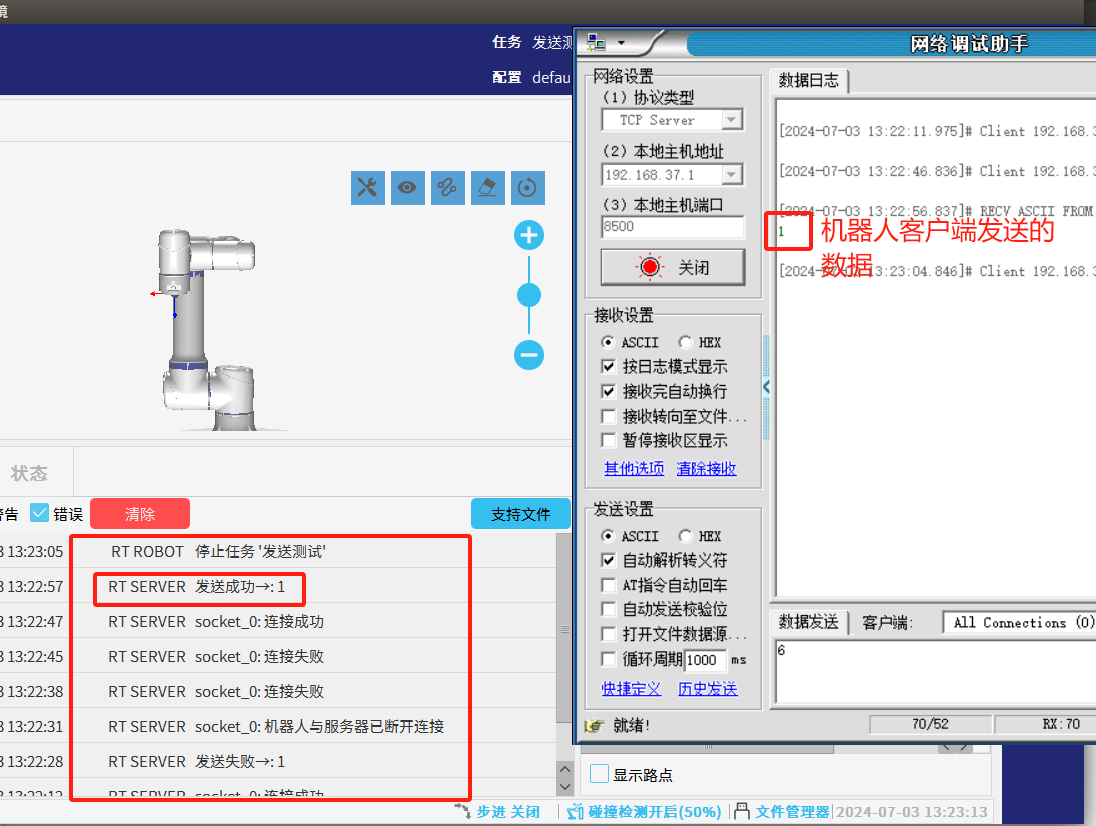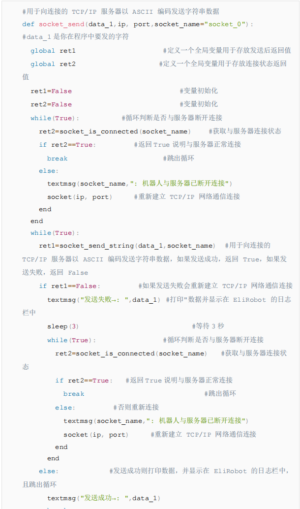 - 以上代码是以发送字符串和读取字符串为例,如果想发送/读取其他数据类型,只需要更换代码中的socket_send_string/socket_read_string即可,具体指令参考CS机器人脚本手册下载中心_机器人技术-leyu.乐鱼(中国)机器人