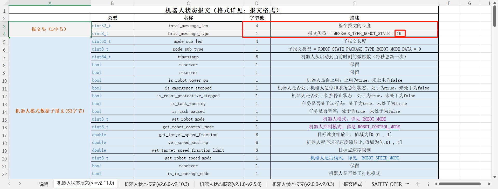 1.通过”机器人状态报文表”得知机器人状态数据总共有1157位字节(5+53+347+101+445+88+10+37+43+28=1157),其中报文头:前面4位字节为报文长度,第5位字节为报文类型=16。
