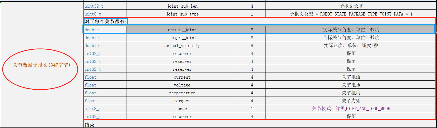 2.首先需要找到关节数据子报文长度“00 00 01 5B”和子报文类型”01“,然后从报文头“00 00 01 5B 01“第1位字节截取到347位字节为机器人模式数据的报文如图2-1-10所示(红到紫)