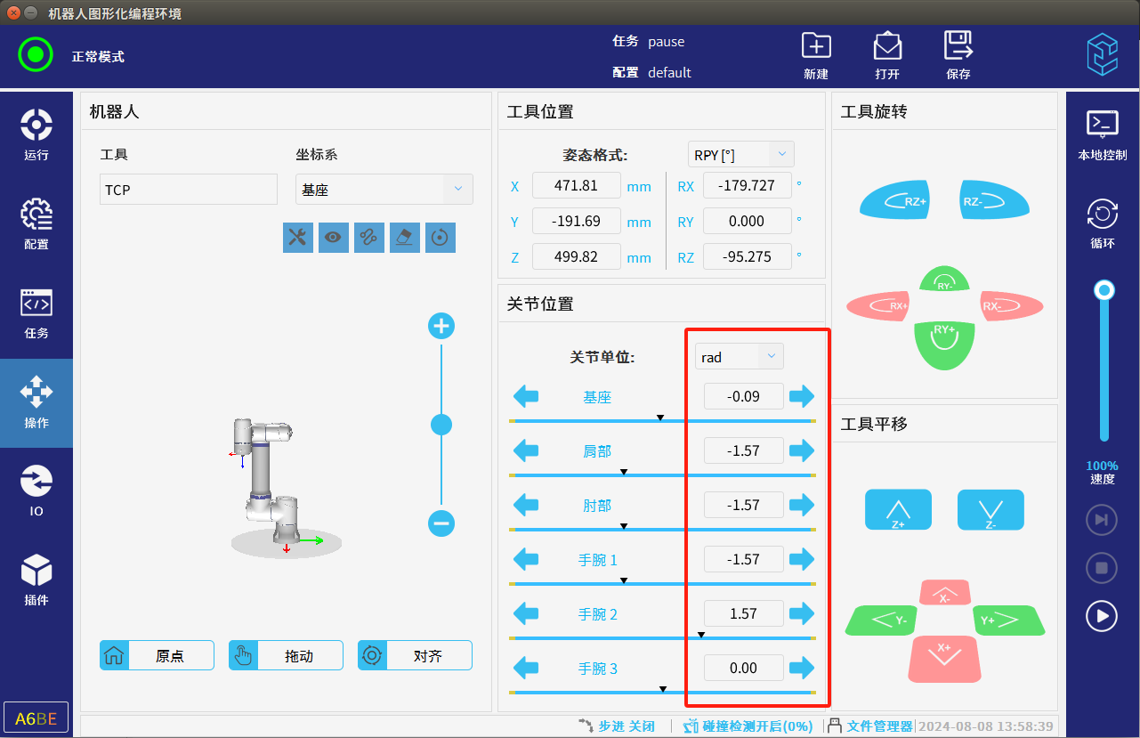 四舍五入保留两位小数后与机器人示教器上显示的数据一样说明解析正确,如图2-1-14,单位(弧度)。