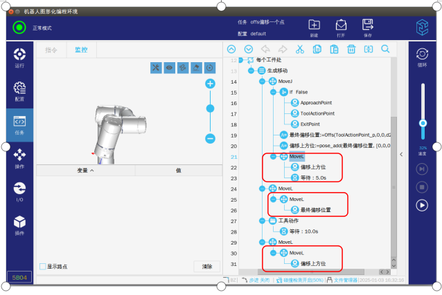 - 使用2.2(方法2)进行偏移时要重新插入一个movel运动指令,然后将偏移点位放在新插入的运动movel指令下(如图-6和图-9红框标记所示)。