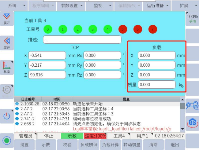 功能:由于每个工具重心质量不同,需要设置合理的负载数值,使机器人能正常工作