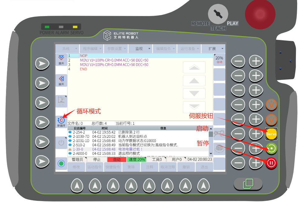 步骤:1. 开机后,点击示教器屏幕左下角红色按钮以清除报警初始化。