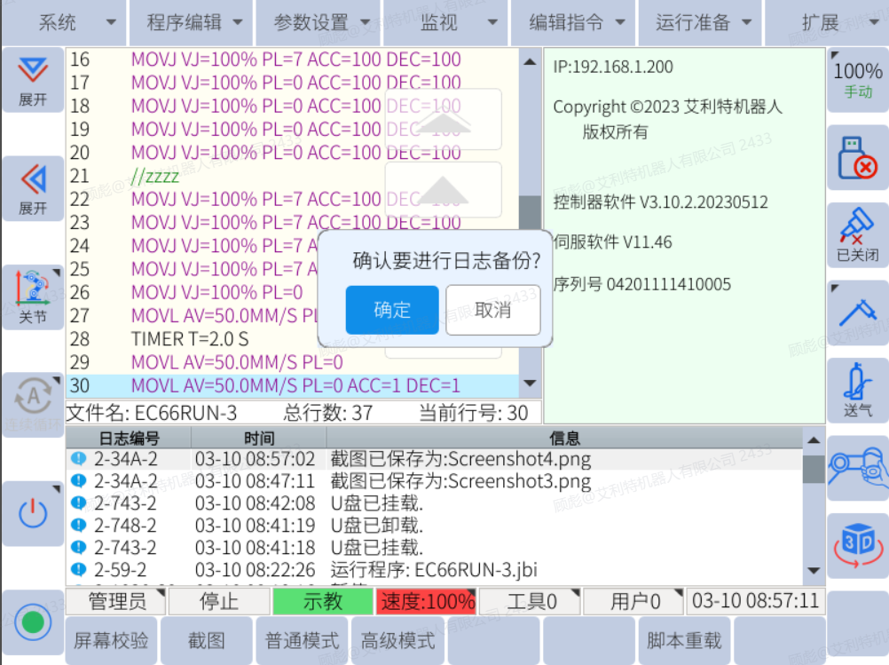 5、  日志时间遵循机器人示教器上的时间。