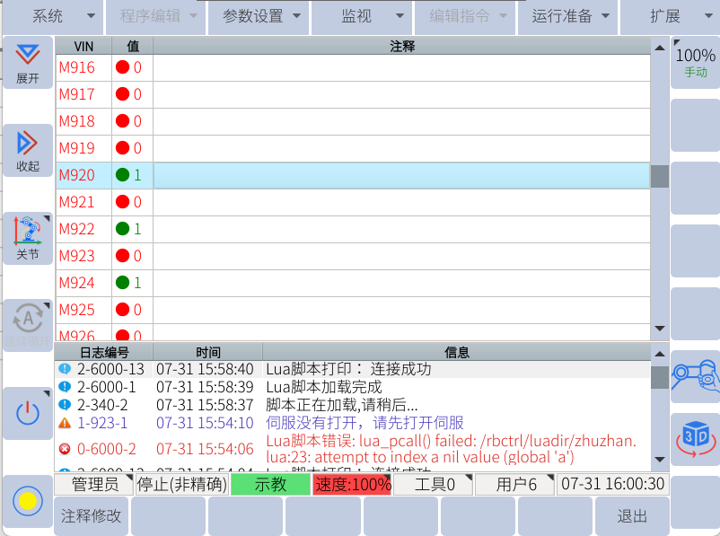 示教器中查看对应的M920、M922、M924分别状态为1