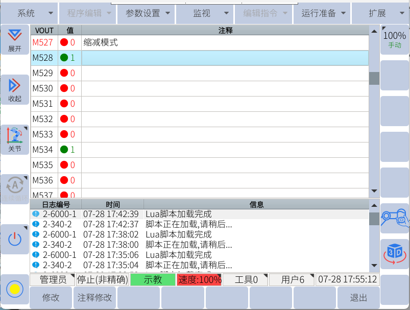 1. M0-M527,M1472-M1535为系统使用,只能读取状态,通过示教器可