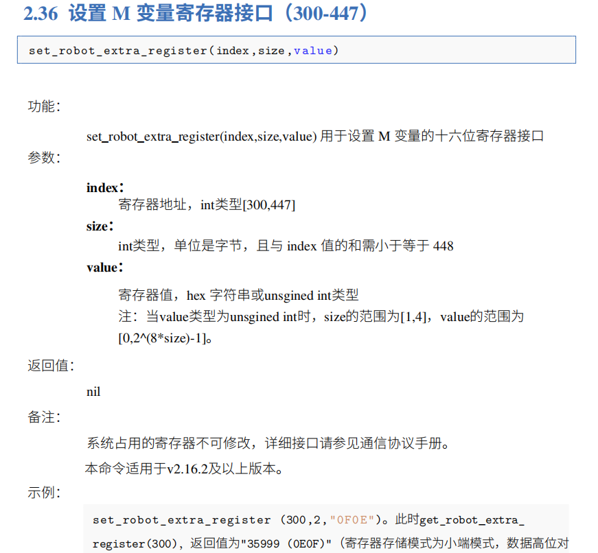 4.第1种指令和第2种指令,建议用户使用第2种指令更方便快捷,第1种指令可直接控制M变量,leyu.乐鱼(中国)modbus寄存器分为8位和16位,需要在兼容模式下更改,否则容易将机器人寄存器地址和网络助手地址混淆。第2种指令本身设置就是16位寄存器,无需考虑兼容模式下的更改情况