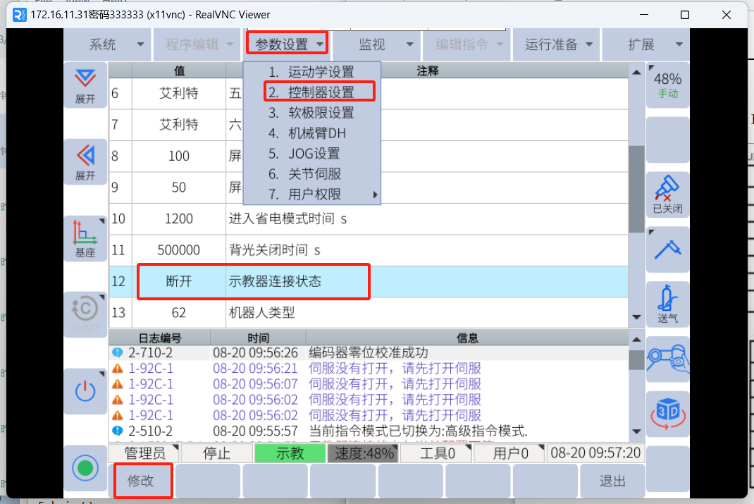 示教器上带有两路急停信号,如果需要拔掉示教器。先要在示教器上将示教器关闭。