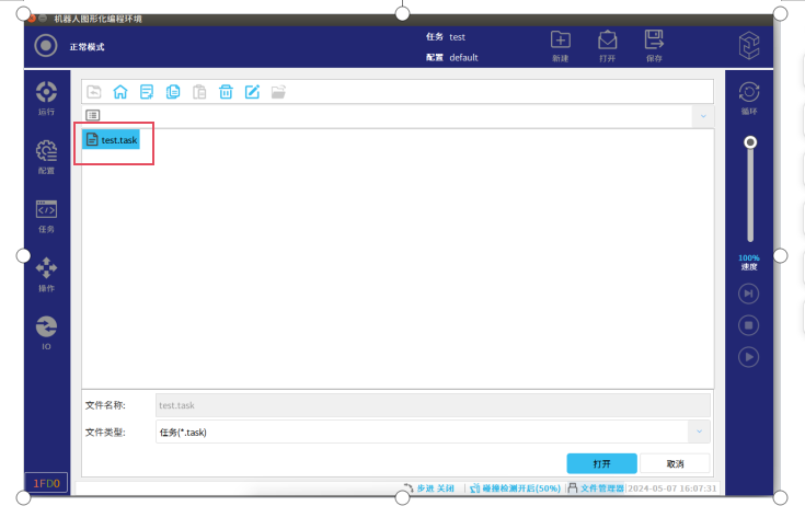 2.5.1在虚拟示教器中编写好所需要的程序并保存,如图-9所示,保存程序文件为“test”