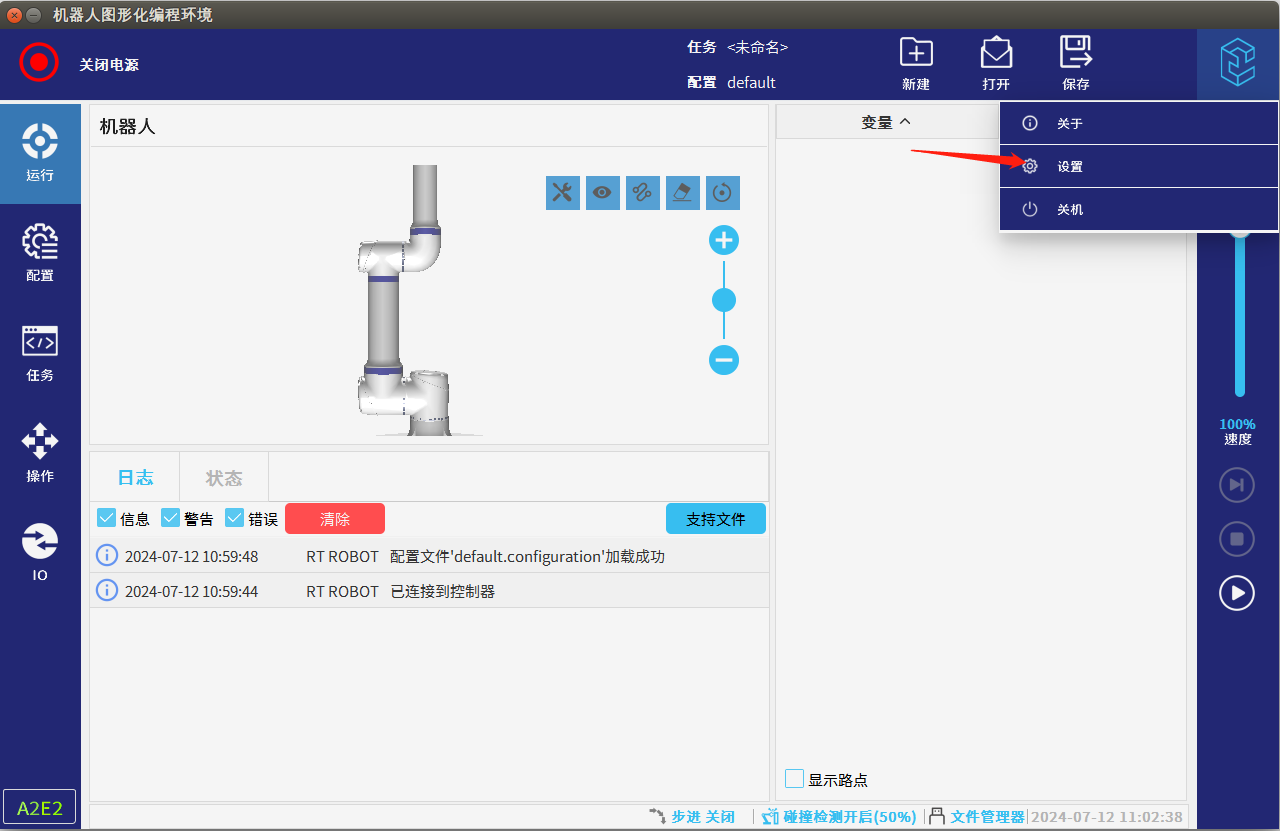 2. 打开机器人软件后,点击右上角leyu.乐鱼(中国)log点击设置。