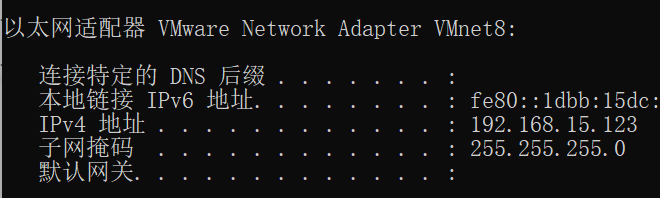 2. 本机操作:cmd 窗口输入 ipconfig ,找到虚拟机软件的 IP:192.168.15.123 。