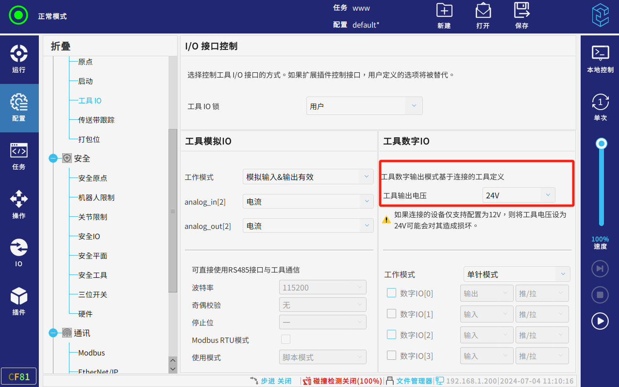 当需要使用末端 RS485 接口与执行器通信时,需要在示教器工具 IO 界面下进行配置,具体配置路径为:“工具模拟 IO>工具模式”,选择 USART 模式,并根据执行器实际参数配置波特率等参数。