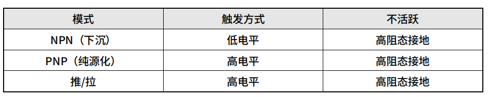 输出接口为 NPN 型输出,支持 1000mA 电流流入。接线方式如图NPN 模式(单针电源模式)所示。