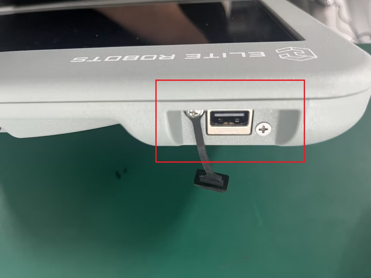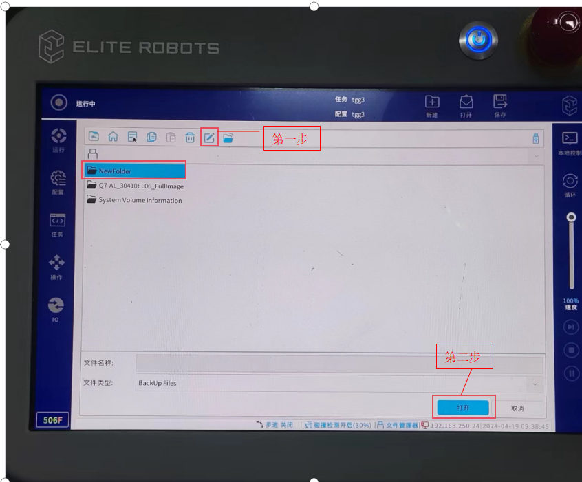 2.2.1:将带有机器人备份文件的U盘插入示教器或控制柜的USB接口,机器人备份文件后缀为.zip,按照图-7操作步骤所示,右上角点击进入到机器人设置界面。