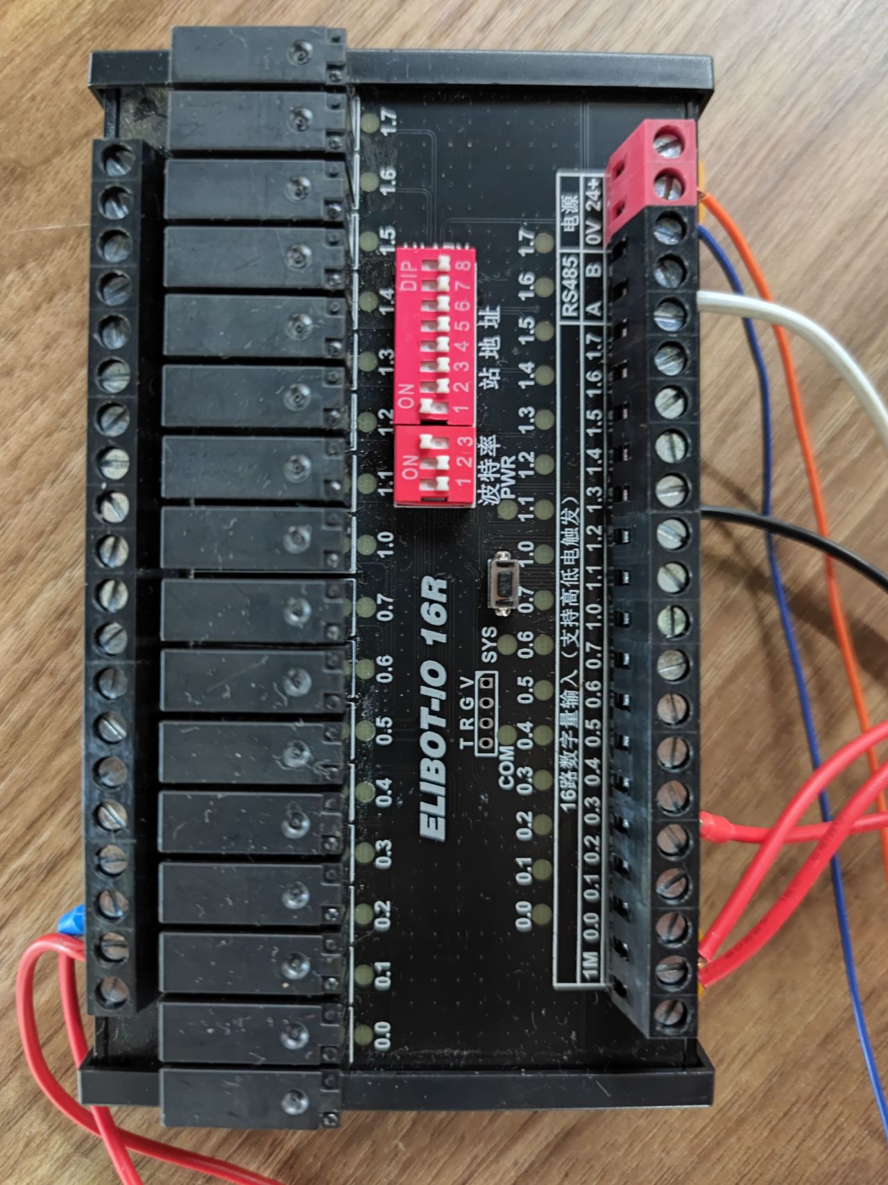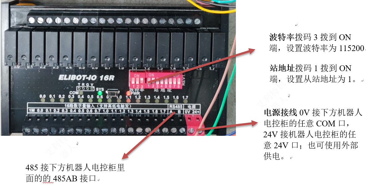 ● 由于机器人脚本里面已经写好搭配IO模块对应的波特率都为115200;IO模块1,站号为1;如需要用到IO模块2,则站号为2;以此类推,故需调整IO模块 的拨码来达到此类设置。