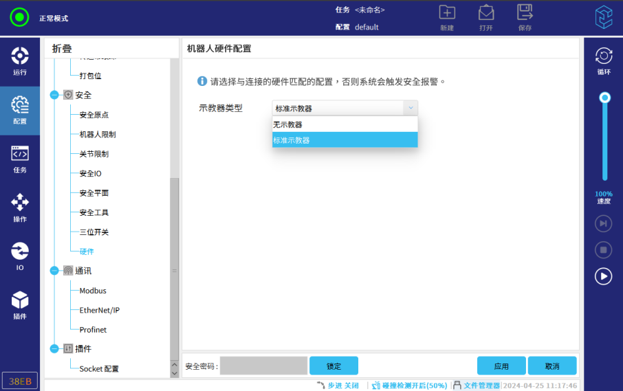 1.是否支持热插拔:不支持,如果不在配置中设置无示教器,直接拔示教器,机器人会报错。