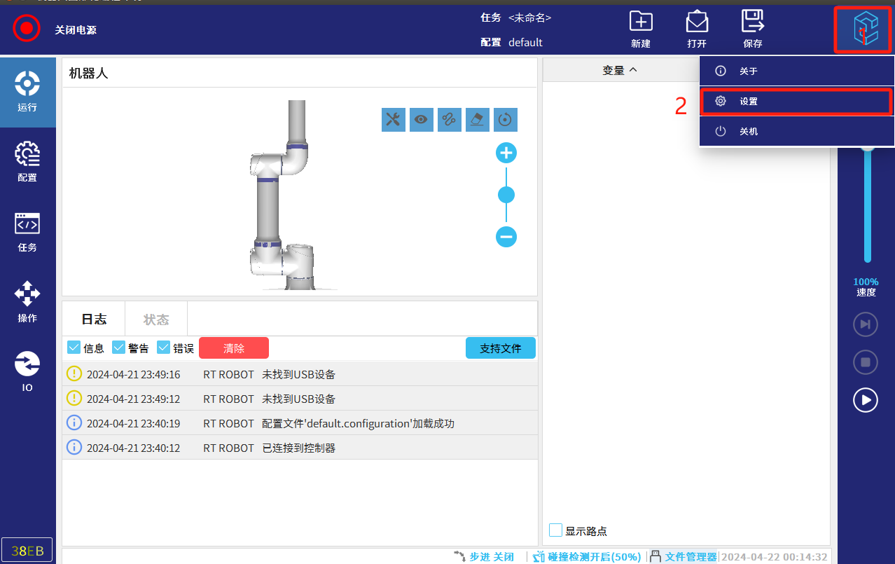 将下载完成的 EUP 格式文件放进 U 盘中,然后将 U 盘装载至示教器上。在主界面进入设置。