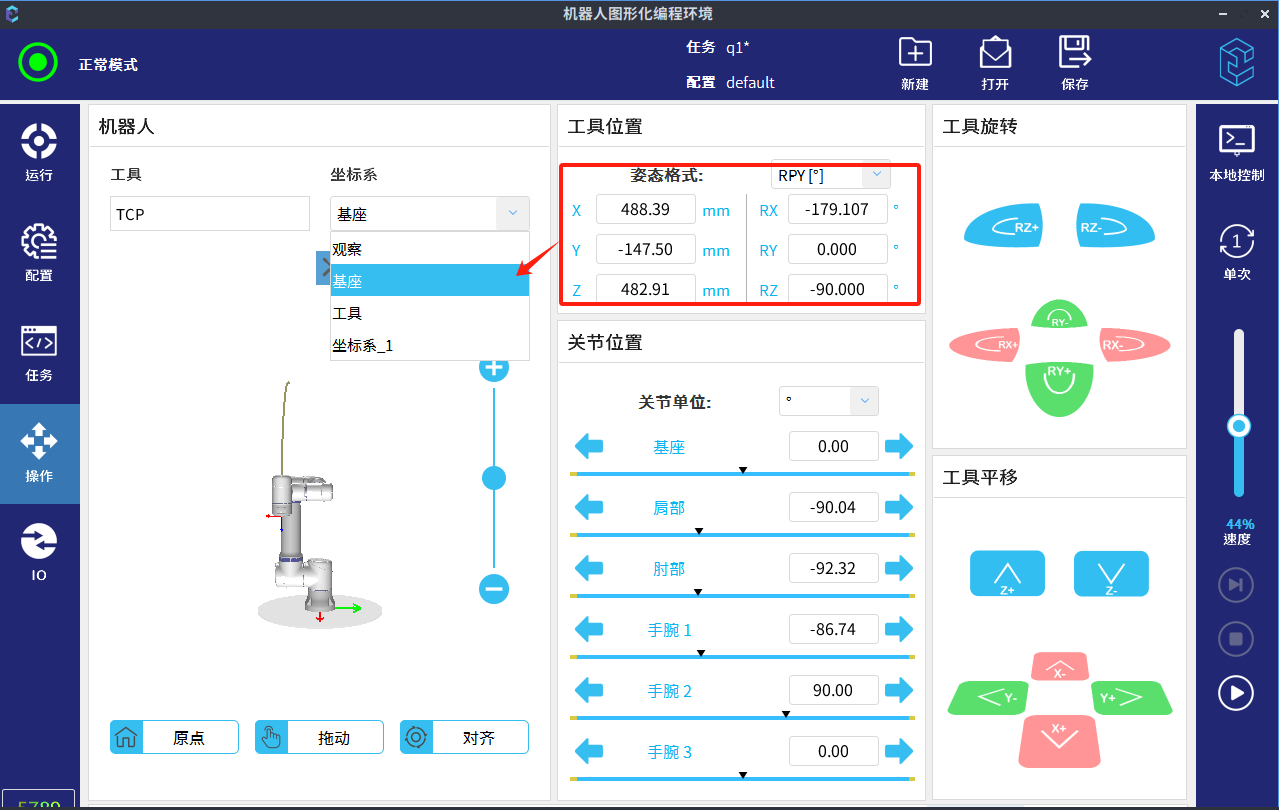 机器人中获取的位姿数据单位,X Y Z是M米为单位,RX RY RZ是以rad弧度为单位;所以在运行点位数据时也同样需要注意将计量单位转换为M米和rad弧度。