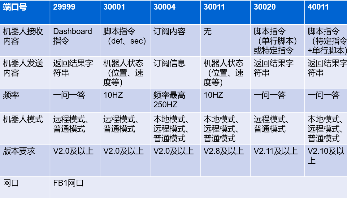 ● 30020(解释器)端口,可用于实现一些动态的脚本排队运行,比如用户在自己的上位机程序,实时计算出一些运行点位,用户在程序运行的过程中,将一些实时计算的脚本排队到当前运行的任务后。