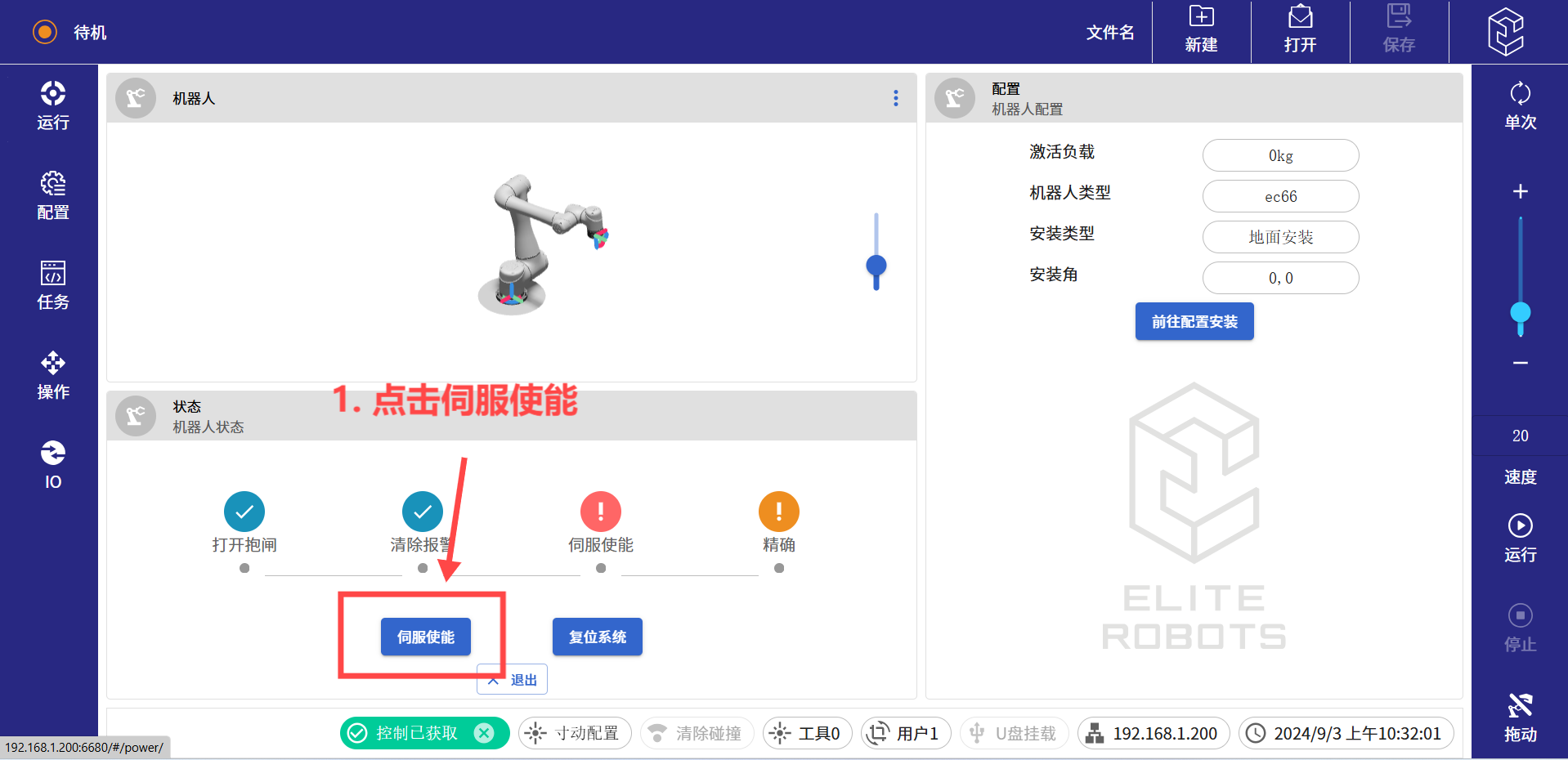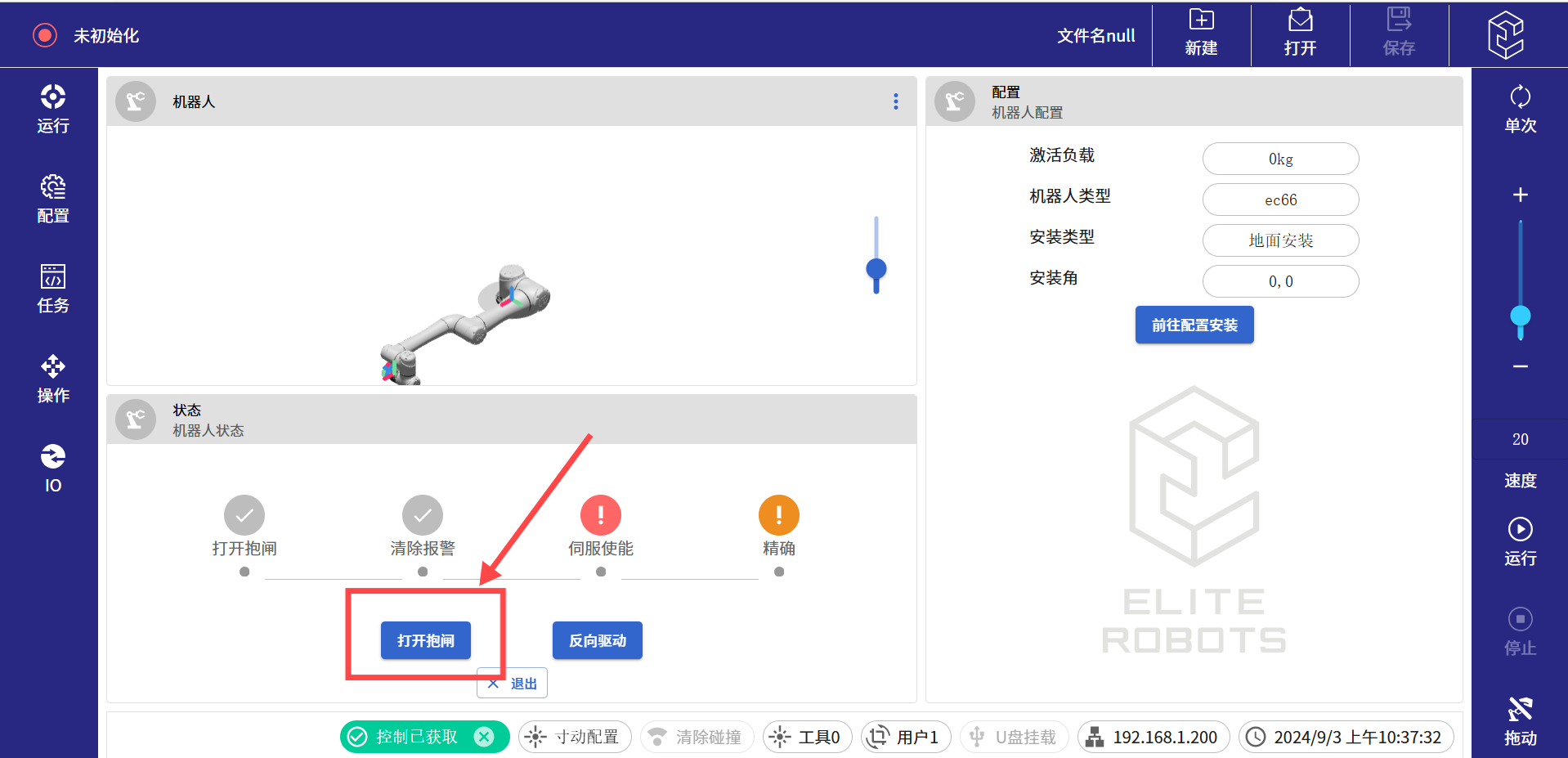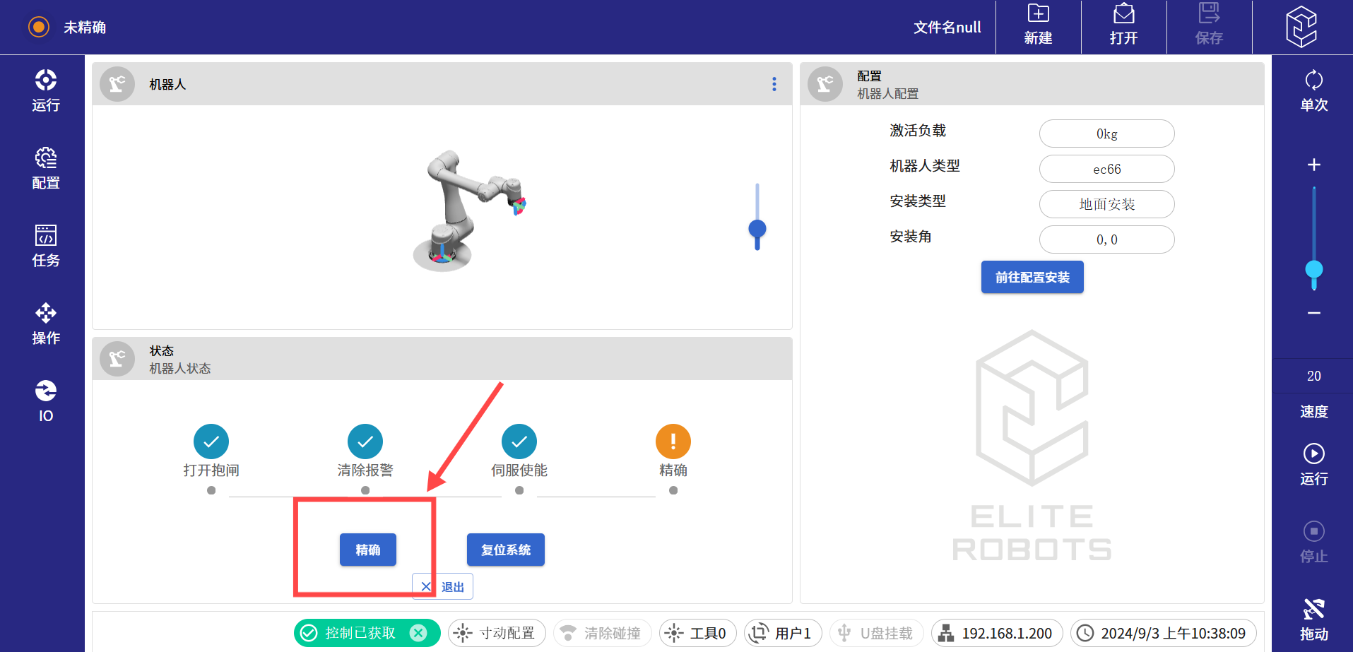 (8)进入待机界面后,依次点击打开抱闸,伺服使能,以及精确。如果使用的是迷你控制柜,第一步还有一个机械臂上电的按钮,点击上电按钮继续往下执行即可。
