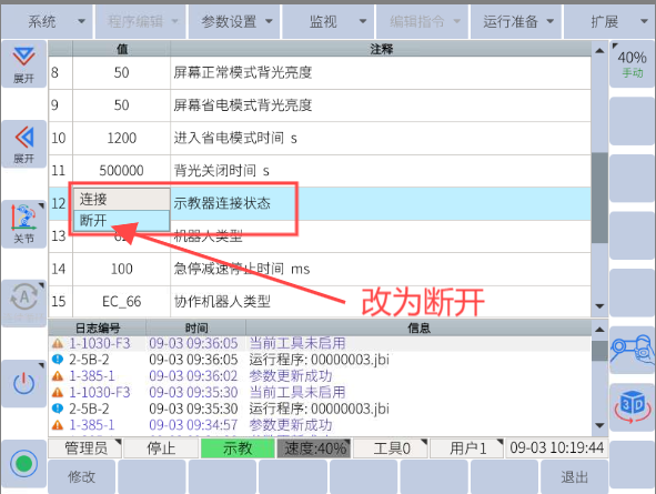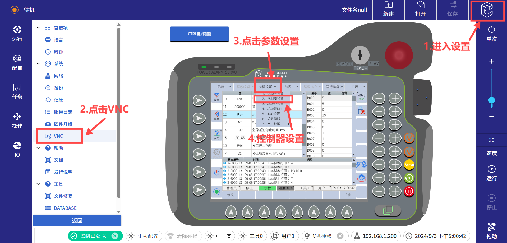 (5)如果机械臂报警提示“机械臂未进入远程模式”或者“示教器连接状态未断开”需进行如下操作(示教器插头已拔出)。进入网页版示教器后,需点击下方获取控制按钮,获取机械臂控制权限,否则机械臂无法操作。然后点击右上角的设置界面,打开VNC,然后点击参数设置>控制器设置>示教器连接状态,把示教器连接状态改为断开。